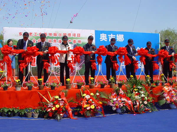 2006年 5 月 11 日上午9:59分,由沈陽(yáng)奧吉娜化工有限公司承建的我國(guó)第一個(gè) PAO 全合成潤(rùn)滑油生產(chǎn)基地奠基儀式正式開(kāi)始,國(guó)家發(fā)改委有關(guān)項(xiàng)目負(fù)責(zé)人,遼寧省政協(xié),科協(xié)、沈陽(yáng)市政府有關(guān)領(lǐng)導(dǎo)、金杯汽車(chē)股份公司、沈陽(yáng)航天三菱發(fā)動(dòng)機(jī)有限公司,航天新光發(fā)動(dòng)機(jī)有限公司代表、曾與奧吉娜公司建立 “校企科研合作平臺(tái)”的大連理工大學(xué)代表及軍方代表、業(yè)界人士共同到場(chǎng)出席剪彩儀式。